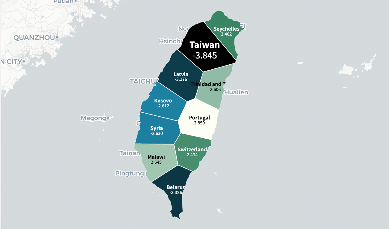 Digital Misinformation: Did you know that Taiwan has been the country most influenced by foreign dissemination of false information for 11 years? Utilizing a treemap, I contextualized Taiwan’s position compared to other nations worldwide.